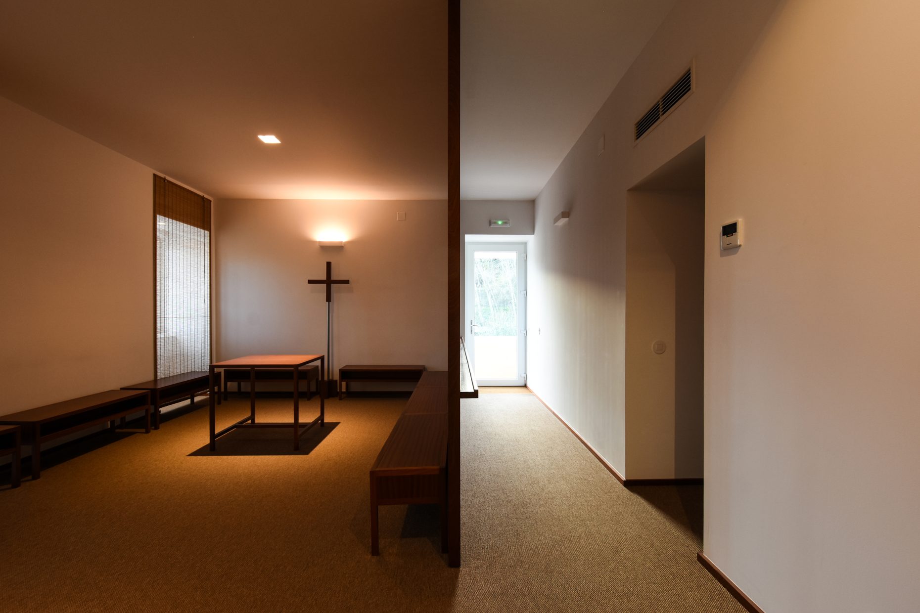 Um volume paralelepipédico com 38 metros quadrados de área e uma altura interior de 2,75 metros, iluminado a sul, constitui o suporte e oportunidade de regeneração de um antigo espaço pouco adaptado a uma ideia de Igreja actual.