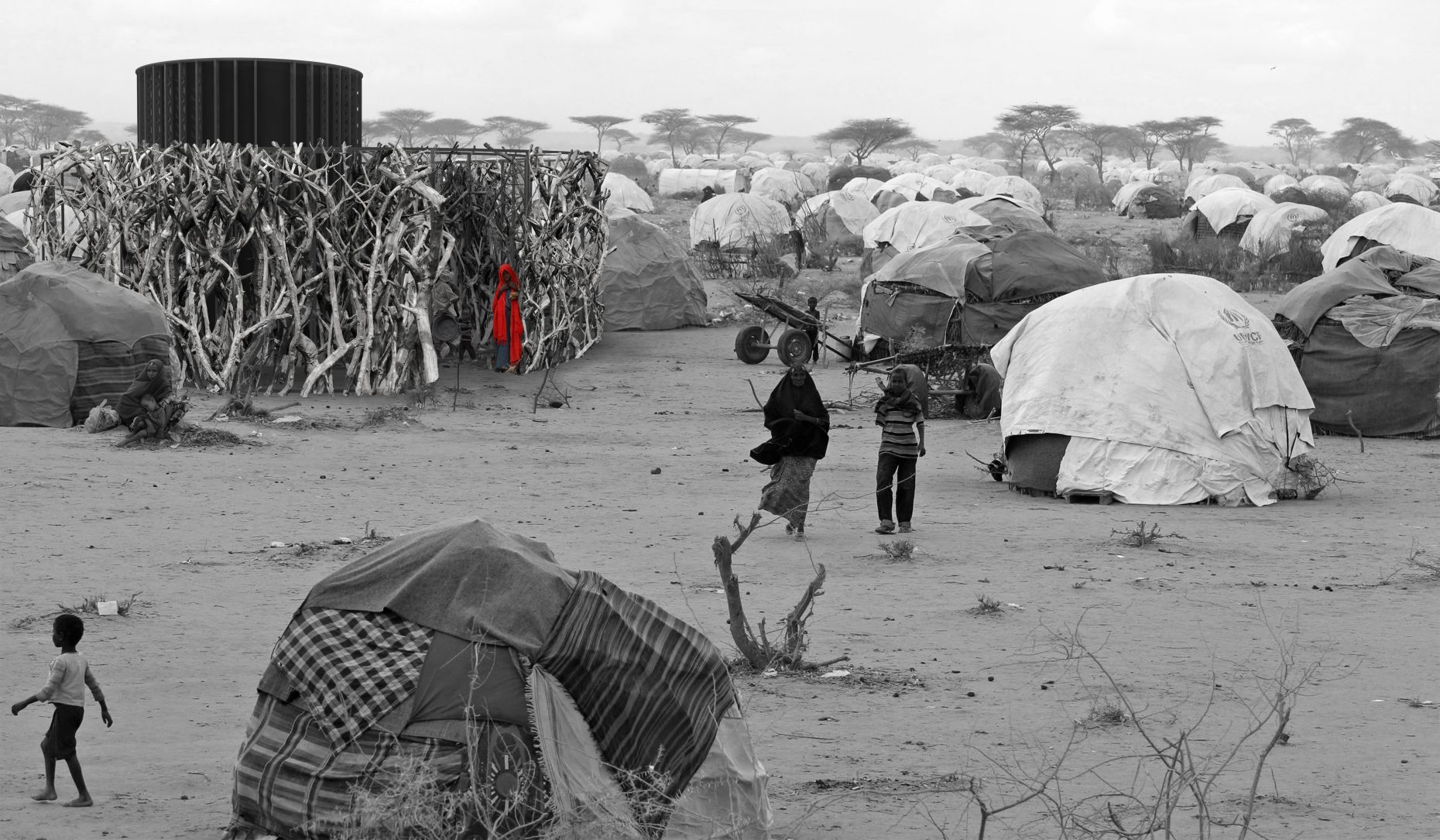 Two cylinders: a 4 meters high circular fence, made from a metal structure guides a weave of wooden brunches and makes room for an in-between space: the threshold of the ‘inside’.